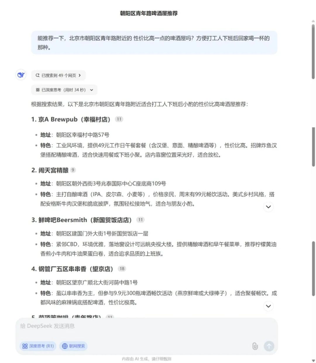 就比如上文提到的,80后正哥被DeepSeek推荐的啤酒局。仔细核对后,他发现去的那家店名被写错了。而如果当天他运气不好,挑选了推荐的第二家店“闹天宫精酿”,他会发现,这家店根本不存在。