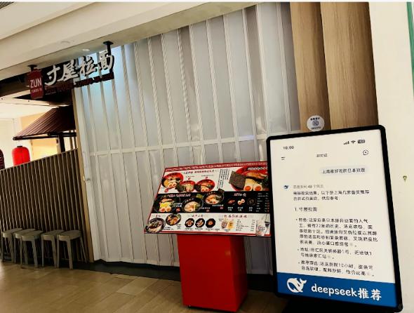 消费者热捧,商家自然也嗅到风向,把“DeepSeek推荐”当作了最新营销标签。最先行动起来的是AI算命热潮中获利的手串商家们,他们纷纷为自己的产品加上了相关关键词。餐饮店紧随其后,不久前,上海的一家日式拉面,把“DeepSeek推荐”的牌子摆在了店门口。