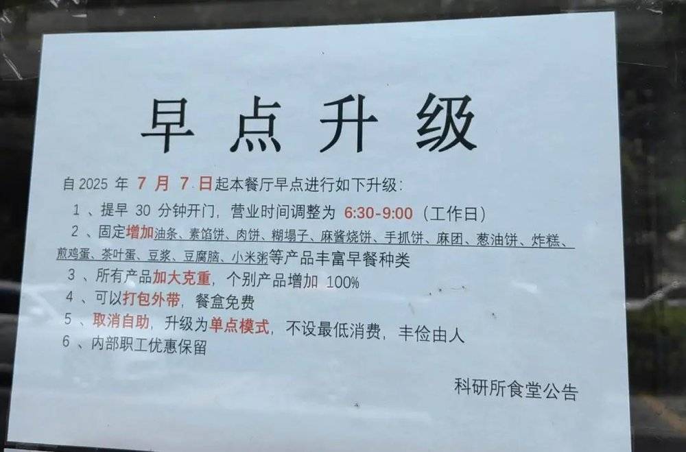 更重要的是,不少善于经营的食堂,除了做好每日的餐食,也会不断汲取社会餐饮的经验,把体验感拉满,让餐厅不断升级。比如卫健委食堂,从7月初开始升级早餐,在门口张贴的告示中明确提出——丰富餐品、加大克重、提早开门迎客,餐盒还免费。这些特点,直击顾客的心,每一个都是“加分项”,让人难以拒绝。