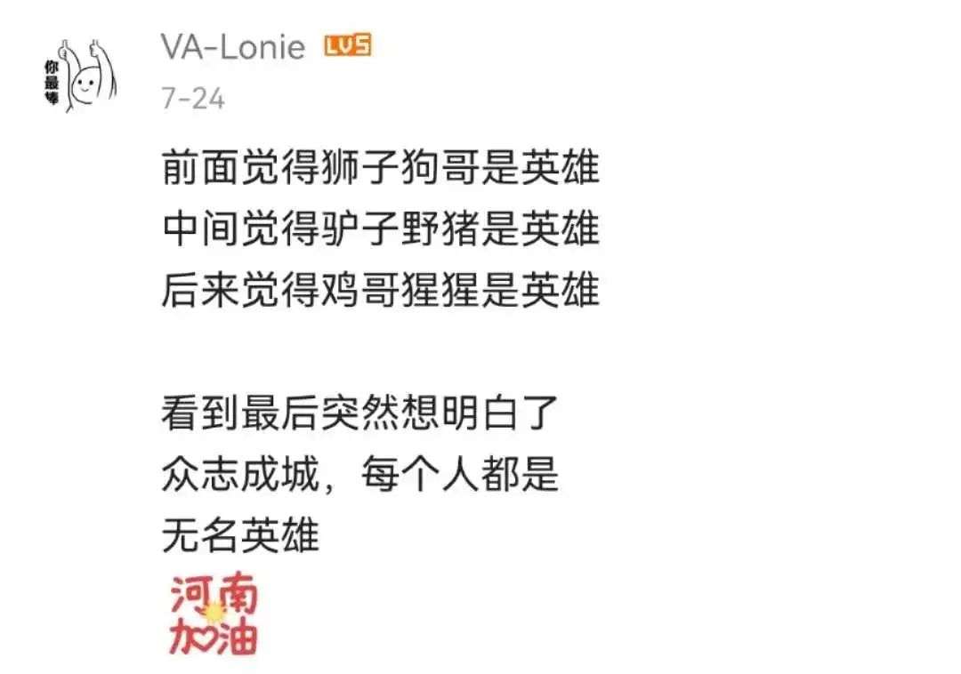 虽然画的是动物,但看视频的人都知道,这些代表的都是在河南暴雨中挺身而出的无名英雄们。