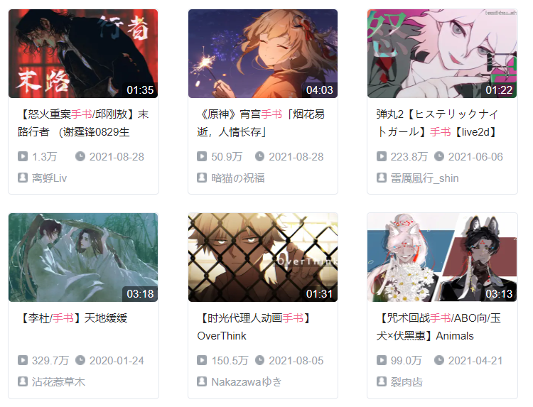 由于“手书”一词最早源于日本,B站早期的不少手书作品都是基于二次元动漫、游戏的同人创作。