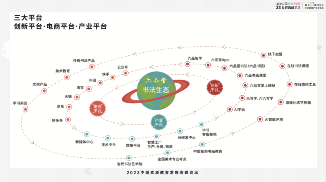 我们公司有三大板块。最早起家是电商,涵盖了电商各个板块,也是我们当下公司最重要的板块。第二个板块是创新。我们的创新不只是书法教育,还有很多基于互联网的创新、在线教育包括一些智能化的研发,构成了公司的创新业务。这些创新的技术,最终都应用到六品书院的书法系统里面。第三个板块叫产业平台。我们有工厂、有研发团队、有研发基地,整个公司人员在疫情时还有1000多人。我们的书法教育在整个板块当中,是在增长的。