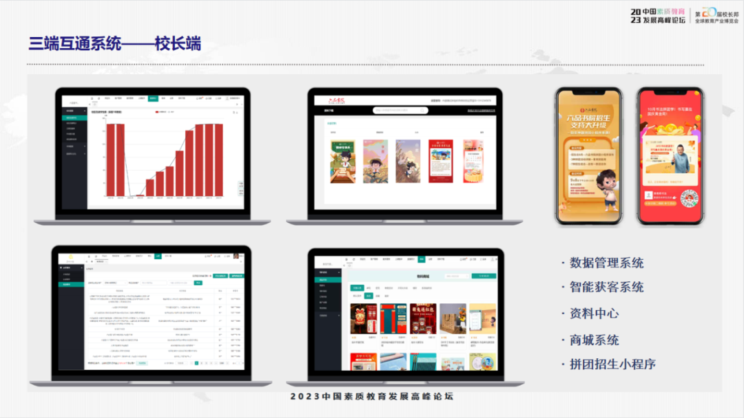 我们六品书院是怎么做书法教育的数智化呢?我们开发了书法教学系统,给合作机构和加盟机构提供了教学系统。这个系统涵盖几个板块:第一,校长端,辅助校区运营管理,有数据管理系统、智能获客系统、资料中心、商城系统和招生相关的小程序等功能。