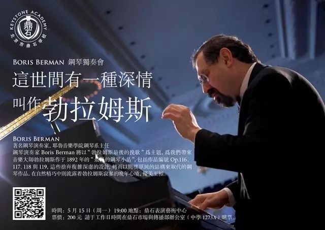 此次音乐会,钢琴演奏家Boris Berman将以“勃拉姆斯最后的挽歌”为主题,为我们带来音乐大师勃拉姆斯作于1892年的“最后的钢琴小品”,包括作品编号Op.116、117、118与119,这些舍弃复杂深虑的设计,转而以简朴单纯的结构来取代的钢琴作品,在自然精巧中则流露着勃拉姆斯寂寥的晚年心境,优美至极。