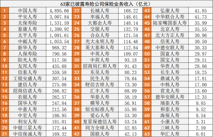 保险业务收入方面,已披露的63寿险公司上半年保险业务收入合计2.07万亿元,6家寿险公司保费超千亿。中国人寿保费收入规模位列寿险公司榜首,达到4895.66亿元,平安人寿保险业务收入位居第二,达到3007.83亿元。