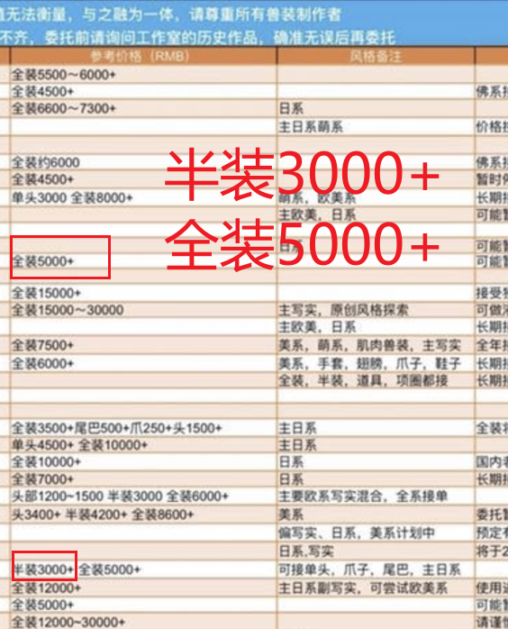 国内兽装工作室的基础报价 图源:网络