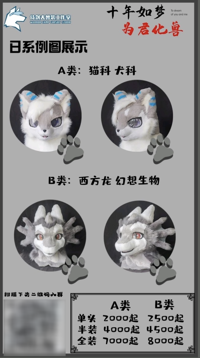 国内的个人兽装师,制作 一套兽装的价格在 8k-1w 左右 ;国外的则会更贵,例如圈内有名的日本天邪鬼工作室 ( A 家) , 价格可以到 2 万元以上 。