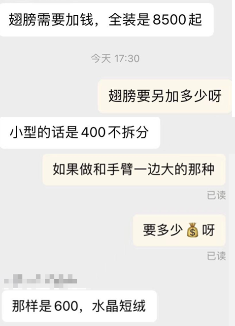如果有翅膀、花色等“私设”,额外还需要加 400-600 元。