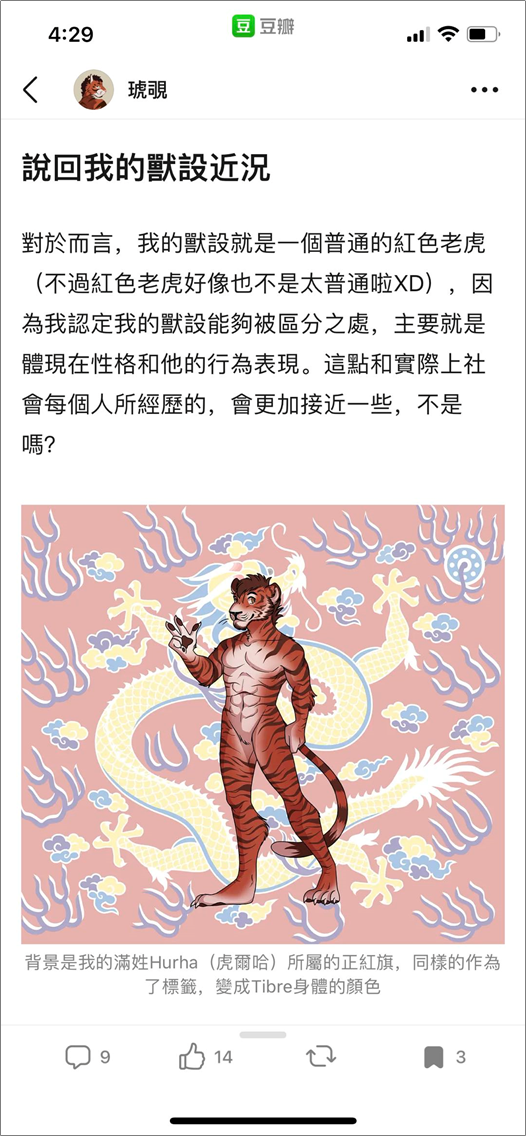 例如,豆瓣用户@琥覗 就为自己的兽设写了上千字,详细的解释了自己这一形象的来源和意义。