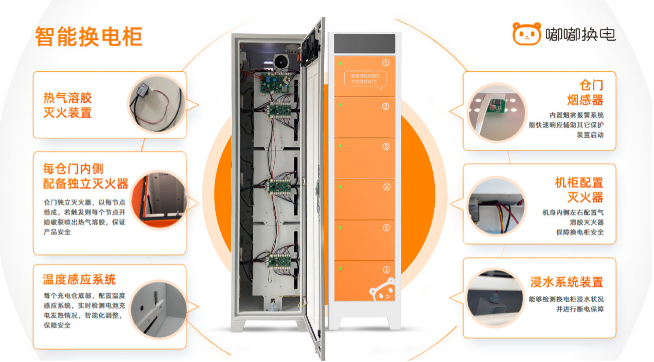 此外,嘟嘟换电的换电柜在安全防护上也做了升级。采用阻燃材料和防爆结构设计,每个仓门内侧配备热气溶胶灭火器、烟感器和温度感应系统,整个机柜配备自动灭火、浸水断电等防护装置,全面保障电池充电安全、存放安全。通过在机柜内置定位系统和物联网模块,嘟嘟换电云平台可全程监控电池状态,当检测到风险时,即对该柜机进行智能化停电,避免由充电不当引发“火烧连营”事故。