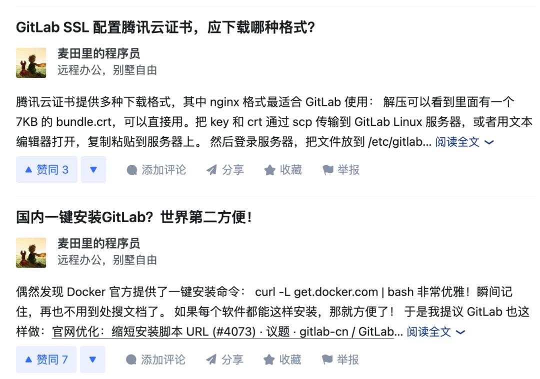 可以看到,其在知乎的帖子大多都是关于技术和少数工程师文化的。关于极狐的帖子有三篇,除了上述提到的两篇,还有就是在极狐 GitLab 通知停止远程办公时候发的。