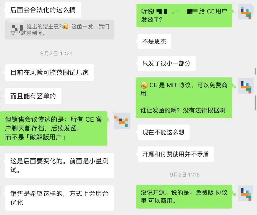 根据“麦田里的程序员”的说法,公司内部很多销售和技术同事都反对这么做,而高层决定推行。曝光的聊天内容显示,公司已经给小部分 CE 用户发函,这些用户“风险可控”而且”能有签单”。支持该政策的内部人员还表示,“开源和付费使用并不矛盾”,后续会将该做法“合法化”。