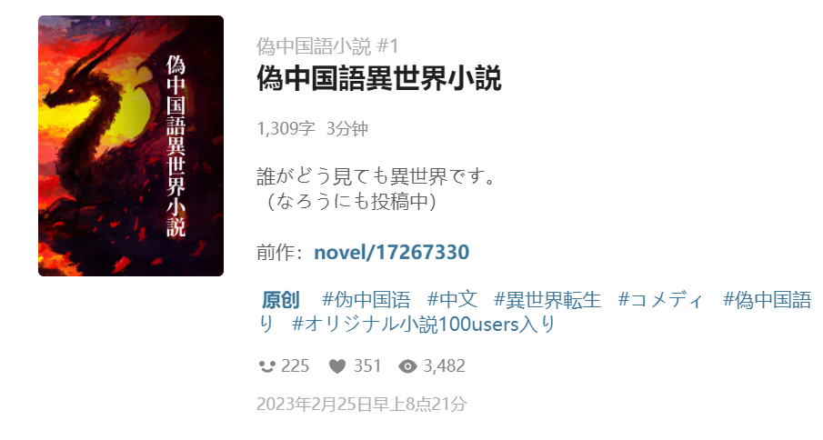 比如上文提到《伪中国语异世界小说》的作者みなもとあるた,在写下这部作品之前,其实已经写过三部用伪中国语写的超短篇文学作品,下图便是其中之一: