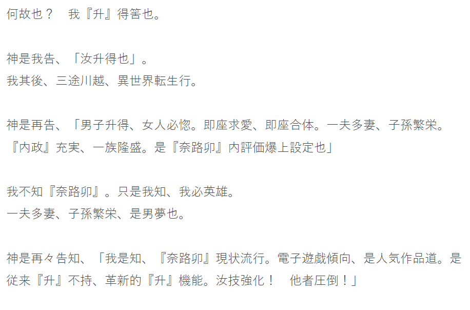 与此同时,文章采用了“伪中国语”这一语言形式,辅以丰富的中国元素,寥寥千字间,竟创造出了一个中日语言、文化互相融合的异世界,可谓格局大开。