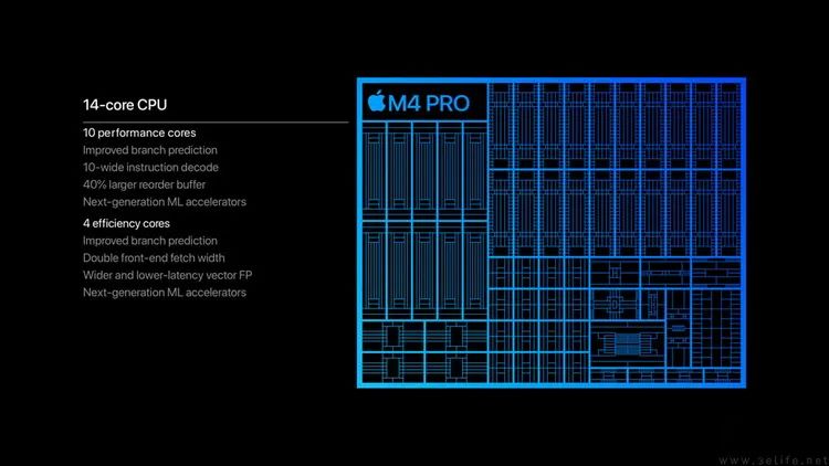 相比之下,M4 Pro这次的产品思路就明显“重回正道”了。如今它有了更多的P核,并凭借制程优势使得主频再创新高。同时其缓存容量也被加了回来,内存位宽、内存频率和GPU规格也都迎来显著的提升。