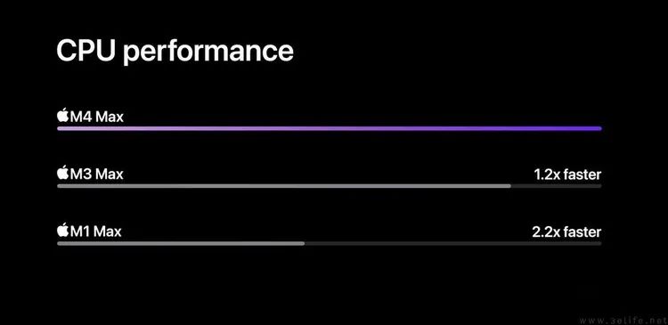 比较有意思的是,在官方公布的性能对比案例中,M4 Max不仅被拿来对比了M1 Max(据称CPU提升了2.2倍),同时还被用于和酷睿Ultra7 258V进行了比较。按照苹果方面的说法,是M4 Max的CPU比258V快了2.5倍,GPU性能更是可以达到后者的4倍。