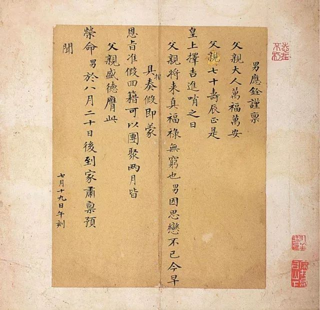 2、古人书信看起来长长短短,错落有致,其实是因为写家书的时候,只要写到了“父亲”,这两个字必须放在信纸的最上方。所以,第一句“父亲大人万福万安”之后,不能继续往下写“父亲七十寿辰正是”,而要另起一行;