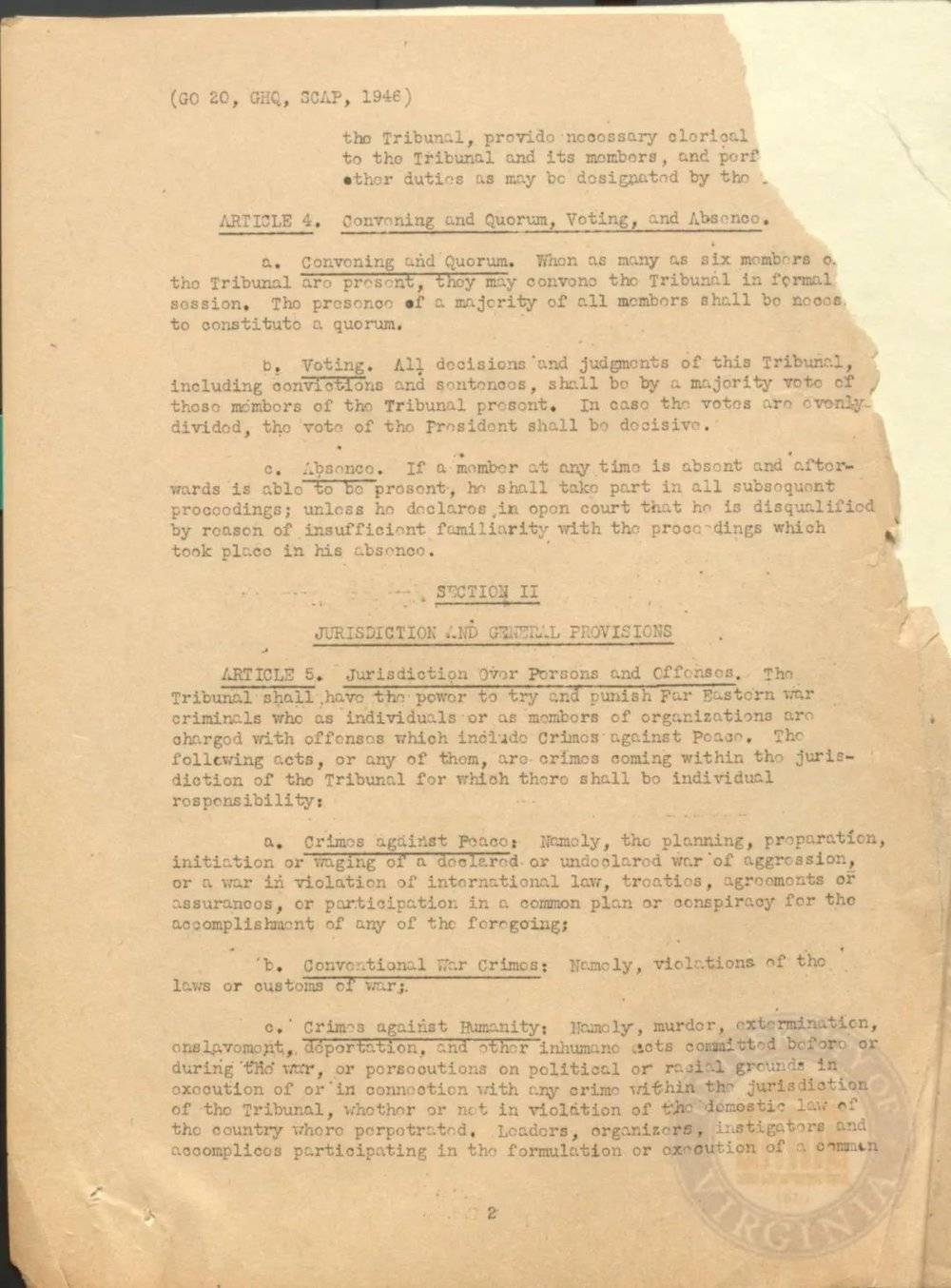 《远东国际军事法庭宪章》第二页,后半部分为宪章第五条的内容(来源:imtfe.law.virginia.edu)