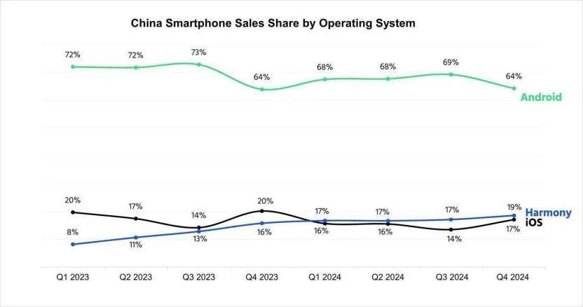 在中国国内市场,Android设备曾长期占有八成以上份额。即便随着华为鸿蒙系统崛起,2024年第四季度Android在中国市场仍占约64%的份额,继续保持主导地位。