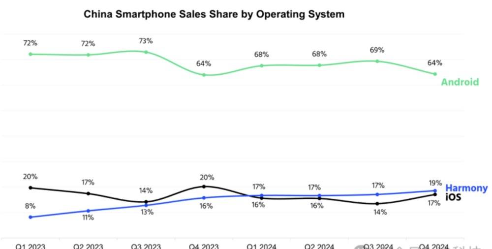 2024年第一季度,华为鸿蒙手机系统出货量已超越苹果iOS,成为仅次于Android的中国第二大移动操作系统。Counterpoint数据显示,2024年Q4鸿蒙在中国手机市场占有率达19%,已连续四个季度领先于iOS的17%。