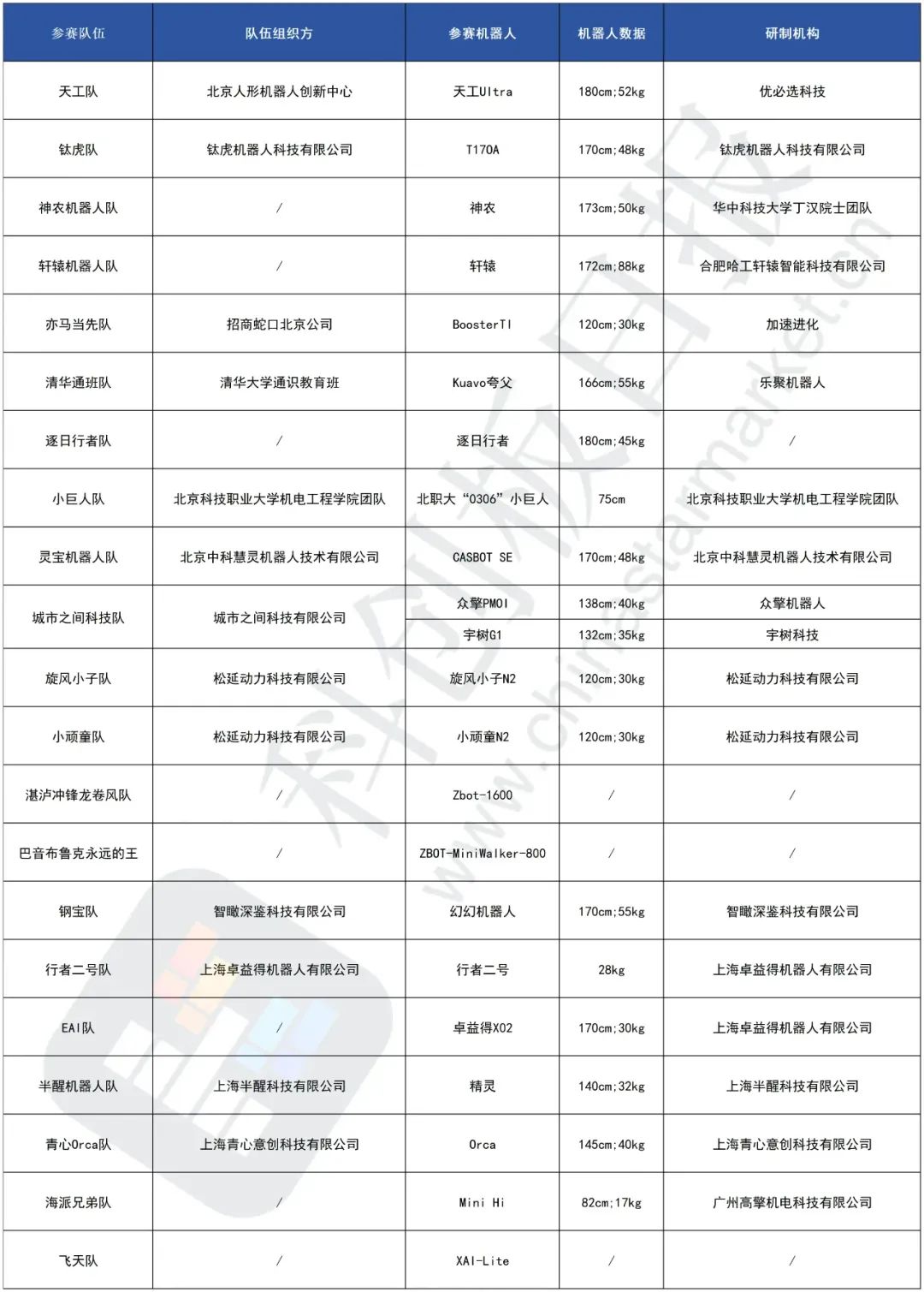 本次参赛的机器人来源广泛,既有来自北京通用人工智能研究院等科研机构及企业的专业团队,也有清华大学、北京科技职业大学等高校的研发队伍,还包括来自上海、广东、江苏等地的竞争对手。