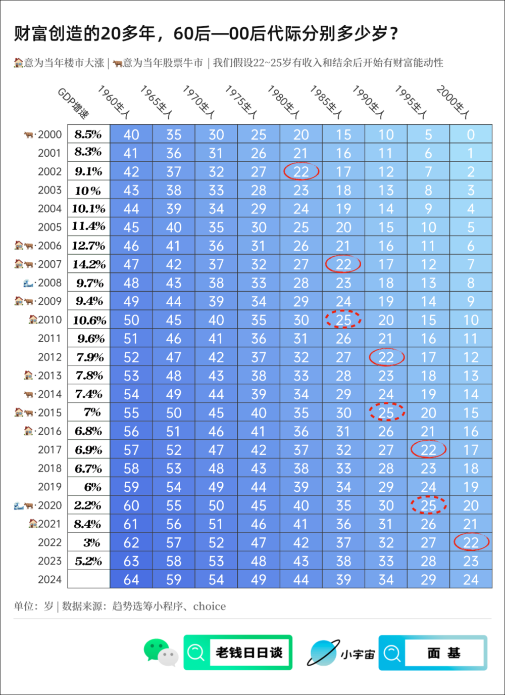 我们都是20岁成人,工作40年,60岁退休,80岁离世,平均而言,大体如此。
