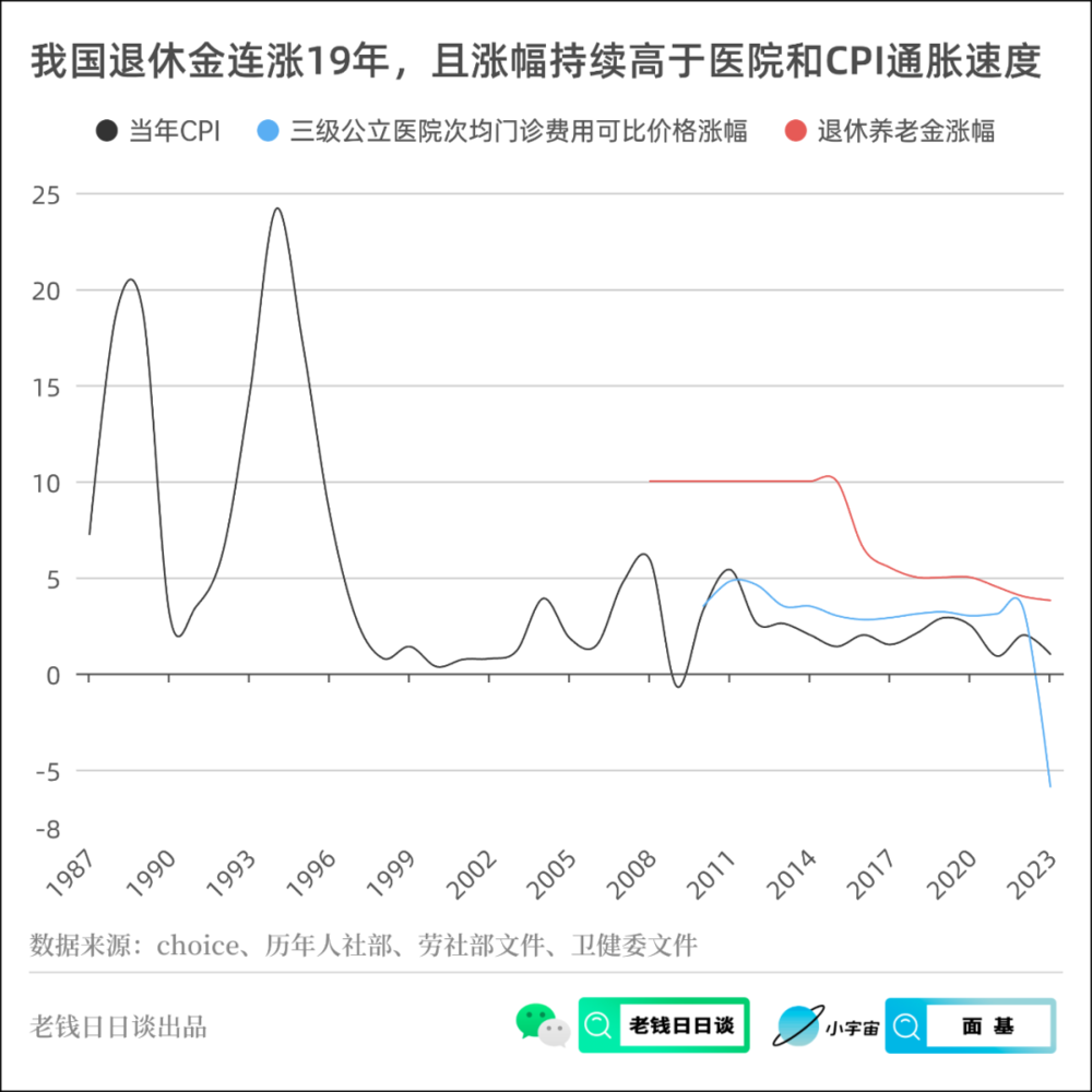 一条真实的养老金可以有效对抗掉前面提到的三大风险——通胀风险,养老金年年涨,且幅度大于CPI: