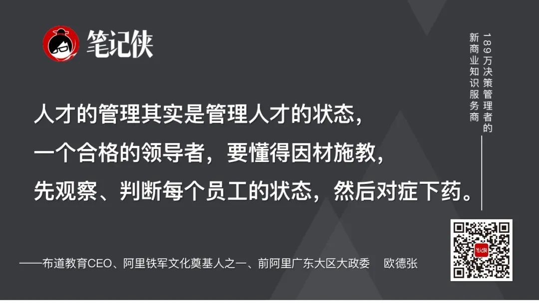 人才管理其实是要管理人才的状态,一个合格的领导者,要懂得因材施教,先观察、判断每个员工的状态,然后有针对性地运用一些方法来提升他们的工作能力,提高他们的工作意愿,这是一个管理者价值的体现。