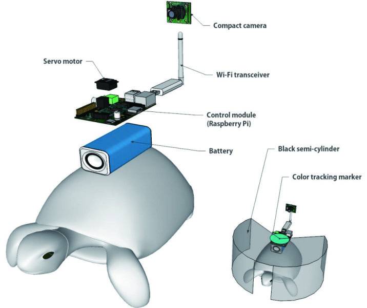 整个人—龟装置如下:用户通过一个带有脑机接口(BCI)的头戴式显示器 ( HMD ) 感知乌龟的外在环境,人类操作员穿戴 BCI-HMD 这一系统,而乌龟的外壳上安装一个「机器人系统」,该系统包含一个摄像头,一个 Wi-Fi 收发器,一个计算机控制的模块,一块电池以及一个带有裂纹的黑色半圆柱体,这个半圆柱体是一个「刺激装置」。这个「机器人系统」可通过 BCI 进行 36 度的转动。