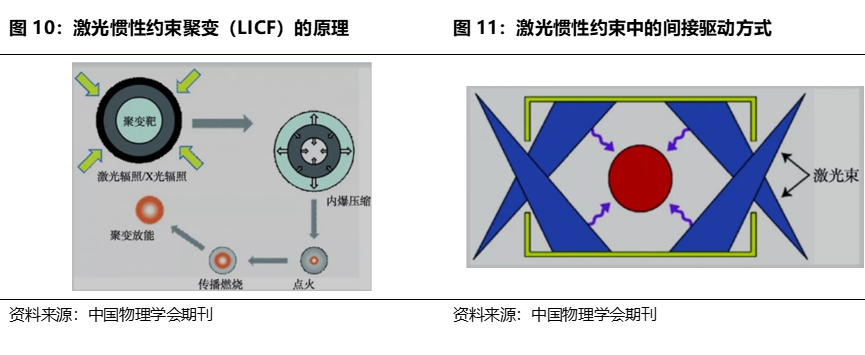 2)惯性约束:核心是靠粒子自身惯性,达成瞬时的高温、高压。首先利用驱动器产生能量,冲击装有燃料的靶丸;靶丸中粒子由于具有惯性,无法迅速散布到周围;此时粒子通过向心内爆被压缩到高温、高压状态,从而发生聚变反应。