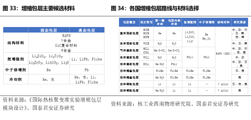 3)增殖单元材料:为氚增殖剂、中子倍增剂用材。氚增殖剂可分为固态、液态两类。固态氚增殖剂多使用硅酸锂(Li4SiO4)、钛酸锂(Li2TiO3)等组装成的“锂陶瓷球床”;而液态氚增殖剂多使用金属锂和铅组合成的“液态金属共晶体锂-铅”(LiPb)。不同氚增殖剂对应不同的中子倍增剂材料,液态氚增殖剂LiPb自身就可实现中子倍增,而固态氚增殖剂则需匹配其他材料。