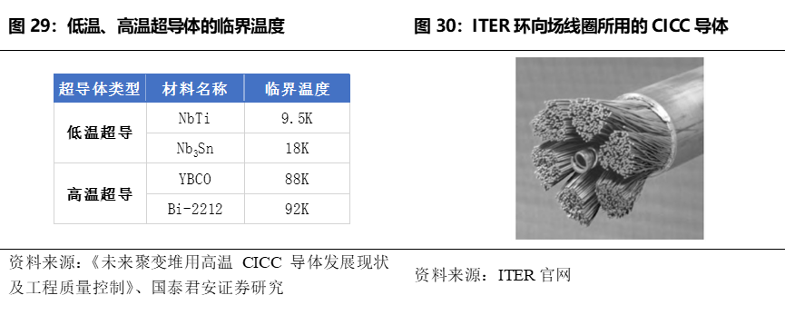 1)磁体系统:传统铜导线在通电后会产生电阻,发热严重,无法维持长脉冲运行。而超导材料在达到一定温度后,电阻会突然消失,从而能够提供更强的磁场。根据超导性显现温度的不同,以“麦克米兰极限”(39K)为界,高于的为高温超导材料(HTS),反之为低温超导材料(LTS)。低温超导材料主要包括铌钛(NbTi)与铌三锡(Nb3Sn),高温超导材料以BSCCO(第一代)、REBCO(第二代)为代表,两者均处于液氮温区(77K)其中Bi-2223/Ag-Au、Bi-2212、YBCO发展较快。
