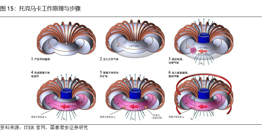 (1)托卡马克工作原理:获得等离子体→持续加热至高温→发生聚变反应→实现自持燃烧
