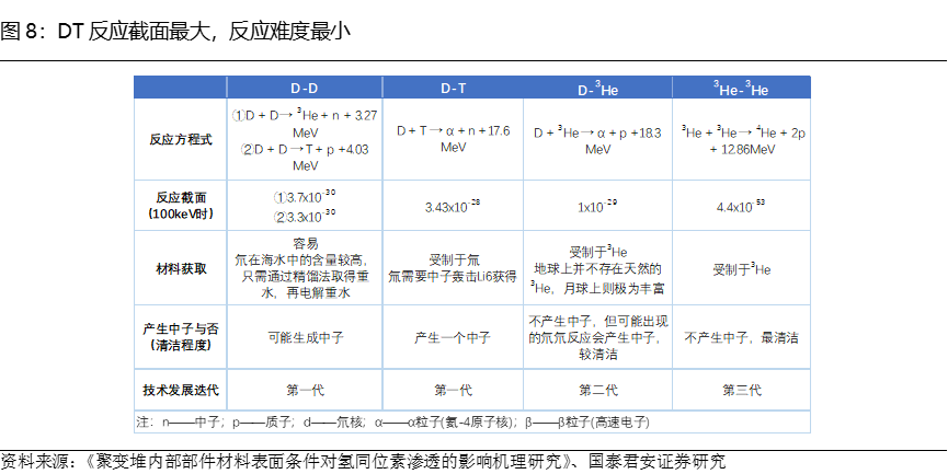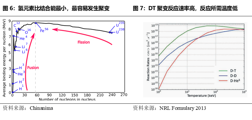 可控核聚变以氢为原料,原因在于氢的比结合能最小,核内质子、中子结合得最不牢固,越容易与其他原子核结合。氢的同位素有氕H、氘D、氚T,在众多组合中,氘氚聚变(DT聚变)反应截面最大,能够发生反应的范围最大,所需促使原子核结合的外力(加热、加压)最小,反应难度最小,因此是目前最为主流的技术路线。