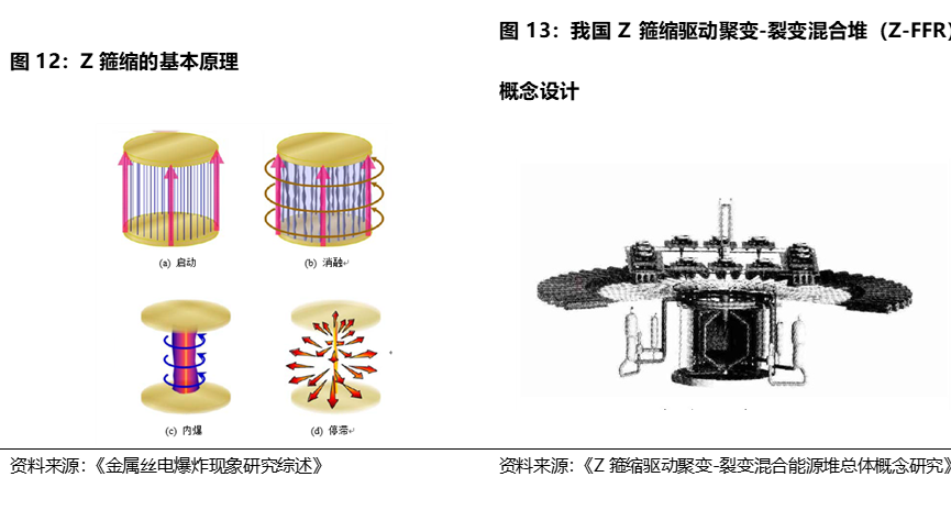 近年来,Z箍缩驱动的惯性约束聚变(Z-ICF)也逐渐成为惯性约束的重要发展方向。箍缩是一种“金属丝电爆炸现象”,主要过程如下:电流通过金属柱形薄套筒→套筒形成等离子体→在洛伦兹力下向中心压缩爆炸。Z箍缩惯性约束聚变就是通过这种“内爆”产生的力量来压缩靶丸,创造高温、高压环境从而实现聚变。相较激光惯性约束,Z箍缩惯性约束的主要优点在于能量转化效率更高。