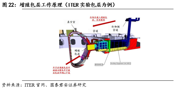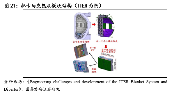 2)包层模块:ITER的包层模块分为包层第一壁、屏蔽模块两个部分。包层第一壁分为三层,最内侧直接面向等离子体,选用铍瓦作为材料,中间以铜铬锆合金作为热沉材料,背后支撑采用不锈钢316LN。我国主要负责包层第一壁的切割、打薄、焊接、组装,布局该环节的公司有国光电气、安泰科技、航天新力。在屏蔽模块,为确保高真空环境,需用热氦检漏设备对焊缝进行检验。