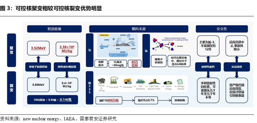 可控核裂变、可控核聚变是和平利用核能的两种方式。裂变开发早,技术成熟,目前已发展至第四代反应堆。聚变反应条件苛刻,仍处实验阶段。不过,相比裂变,聚变放能多、原料丰富、放射性废物少、安全性高,是我国核能发展“热堆-快堆-聚变堆”三步走的高阶阶段。