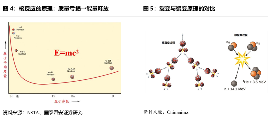 核能本质上是对于核反应的能量加以利用。核反应是原子核之间的反应,即核内质子、中子重新排布后形成新的元素;反应前后原子核总质量不同,其轻微亏损会转化为能量而释放。其中,裂变可以理解为“打碎镜子”,在中子轰击下,铀原子核会变成另外两个元素的原子核和中子。聚变可以理解为“破镜重圆”,由两个氢元素的原子核发生碰撞,生成氦原子、中子。