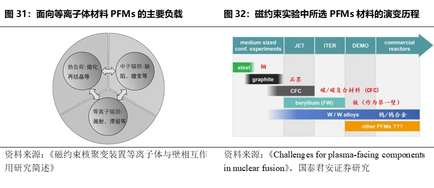 2)面向等离子体材料(PFMs):是指直接面对一亿摄氏度高温等离子体的材料,主要有包层第一壁、偏滤器靶板用材。由于面临热负荷、中子辐照、等离子体辐照三重负载,对材料性能的要求较为严苛。