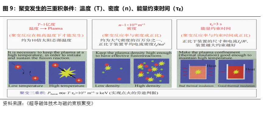 聚变反应发生的条件较为严苛,需要足够高的密度(n)、极高的温度(T)和较长的约束时间(τE)。其中,高温(T)确保了粒子有足够的速度,来克服库伦斥力并相互靠近,至少要达到1亿度;密度(n)的提高增加了粒子碰撞的概率,至少要达到1020m-3;能量约束时间(τE)用来衡量热损失的时间,该值越高意味着能量损失越慢,至少要>3s。将温度、密度、能量约束时间相乘,得到聚变三重积(n*T*τE),该值可用于判断聚变效果。