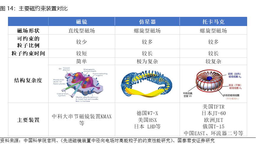 磁约束的主要装置包括磁镜、仿星器、托卡马克(Tokamak)等。其中,托卡马克是目前实现粒子约束的主流装置,约束效果好、装置结构相对简单。