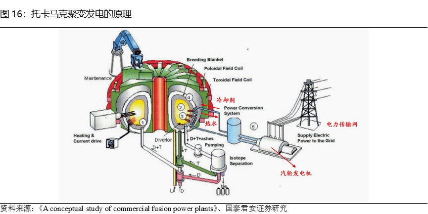 聚变发电依赖于反应产生的中子,中子在装置内壁减速直到完全停止,将动能转化为热能,再由冷却水带走,与热交换器(蒸汽发生器)相连换热,推动汽轮发电机组发电。