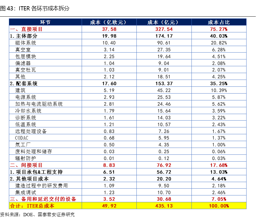 直接成本在ITER总成本中占比为75%,其中主体部分成本、配套系统占比分别为40%、35%。在主体部分中,磁体系统涉及超导的研制,技术壁垒高、线圈数量大,成本高达21%。真空室体积大、耗材多,成本占比为6%。包层模块所用铍材料价格高、加工难,成本占比为5%。配套系统中,电源、冷却水系统的技术已经相对成熟,成本占比分别为6%、4%;加热与电流驱动系统的作用在于为等离子体加热,需要能够提供高输入功率,涉及物理问题复杂,仍处于设计阶段,成本占比为6%。