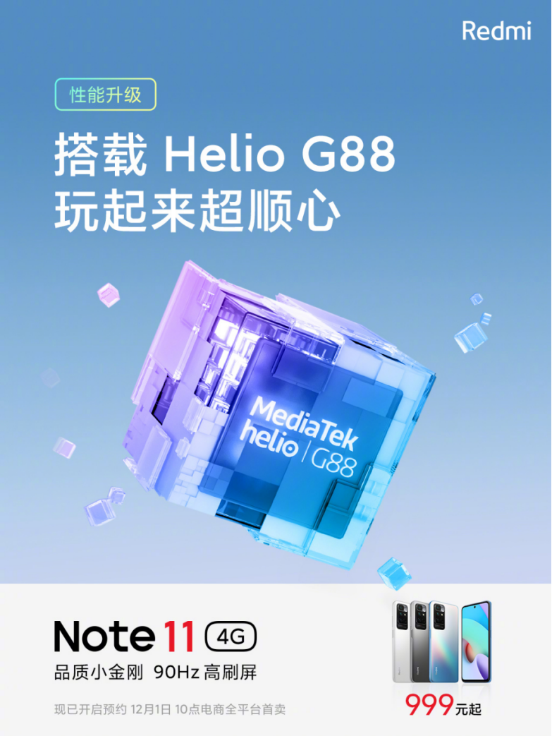 3、Redmi Note 11 4G版发售:搭载联发科G88芯片,支持90Hz三档刷新