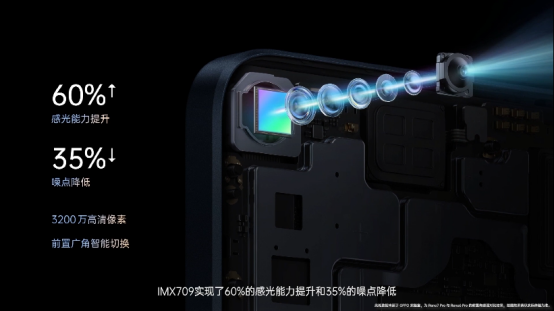 此外还全球首发IMX709超感光猫眼镜头,RGBW图像融合单元集成在IMX709传感器内,在OPPO Reno7系列上首次商用,相较于IMX615实现60%感光能力提升、35%噪点降低,同时具备更高的动态范围和画面宽容度,且能智能切换广角。
