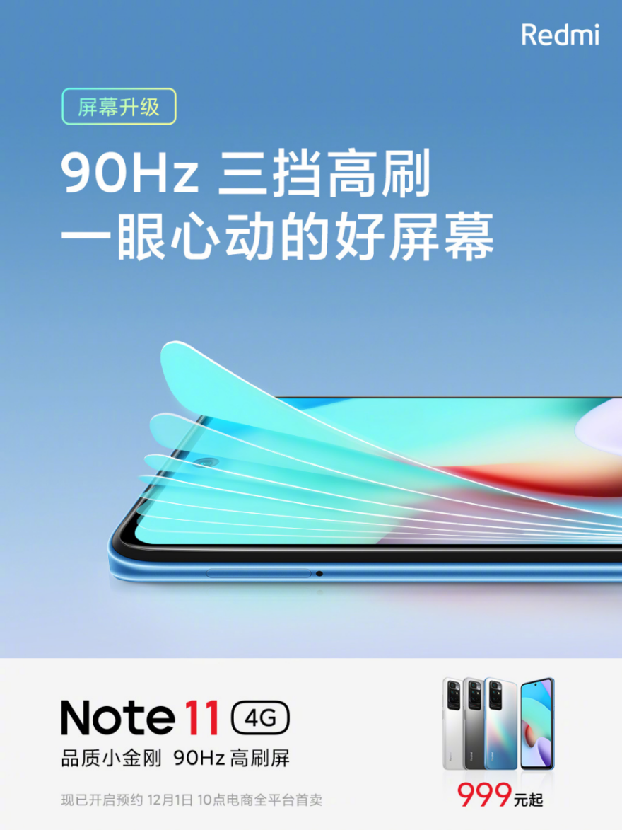 售价方面,Redmi Note 11 4G品质基本款4GB+128GB 版本售价 999 元,6GB+128GB版本售价1099 元。
