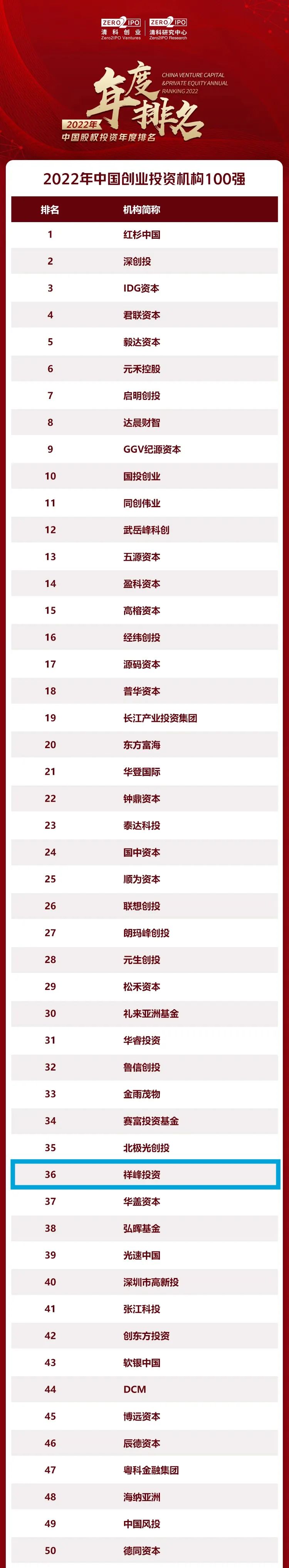 VC榜第18名!祥峰入选“投中年度中国最佳创业投资机构TOP20”