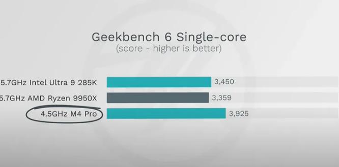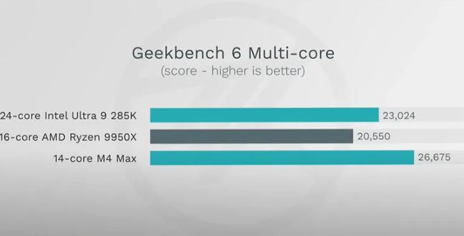 至于性能定位更高的M4 Max,则是在单核、多核测试中均碾压了Ryzen 9 9950X和酷睿Ultra 9 285K,让整个PC市场感受到了苹果的强大。而且,在测试中M4系列芯片的核心主频及核心数都明显低于两个对手,只有4.5GHz,但是却展现了更高的单核及多核性能。