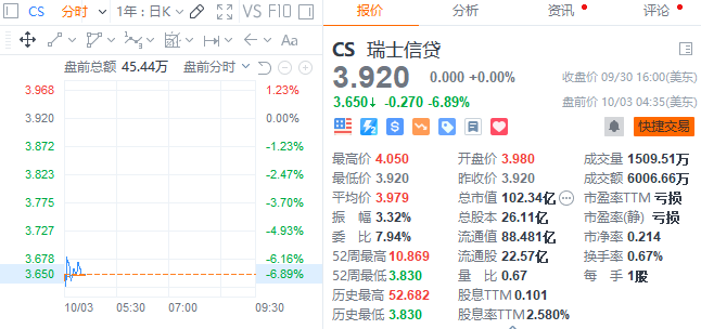 10月3日周一,在有市场传言称瑞士信贷濒临破产后,瑞信的信贷风险指标升至创纪录水平。