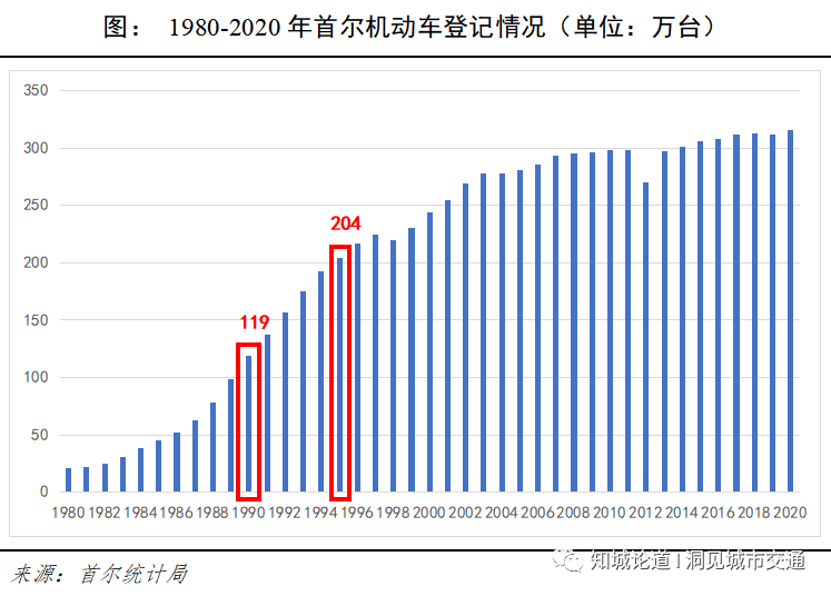 80年代以经济增长为基础,首尔市正式进入了私家车时代。首尔市的汽车数量从1980年20万辆,1985年45万辆,1990年开始急剧增加到120万辆,到1995年突破了200万辆。